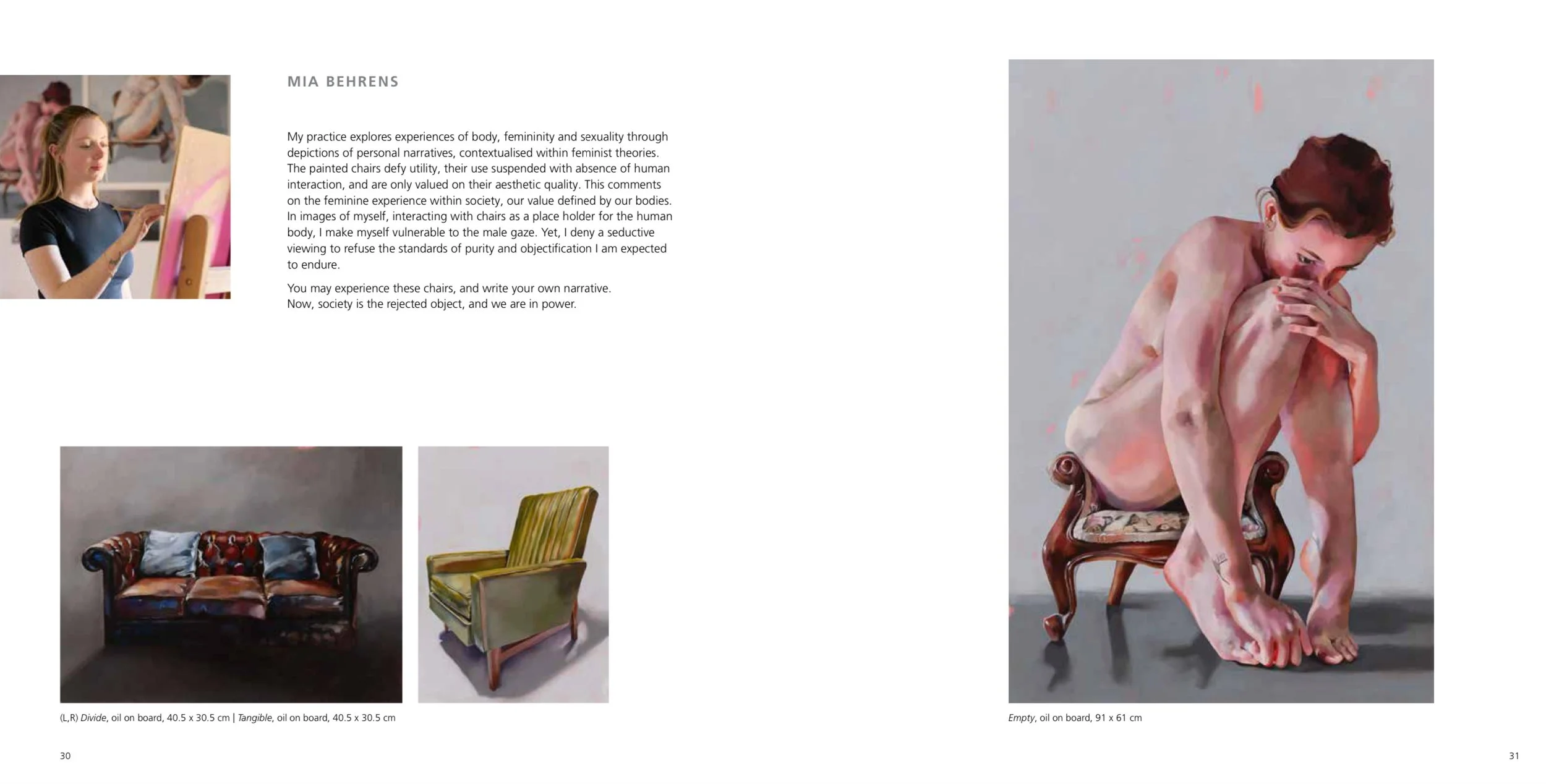 This body of work explores experiences of body, femininity and sexuality through depictions of personal narratives, contextualised within feminist theories. The painted chairs defy utility, their use suspended with absence of human interaction, and are only valued on their aesthetic quality. This comments on the feminine experience within society, our value defined by our bodies. In images of myself, interacting with chairs as a place holder for the human body, I make myself vulnerable to the male gaze. Yet, I deny a seductive viewing to refuse the standards of purity and objectification I am expected to endure.